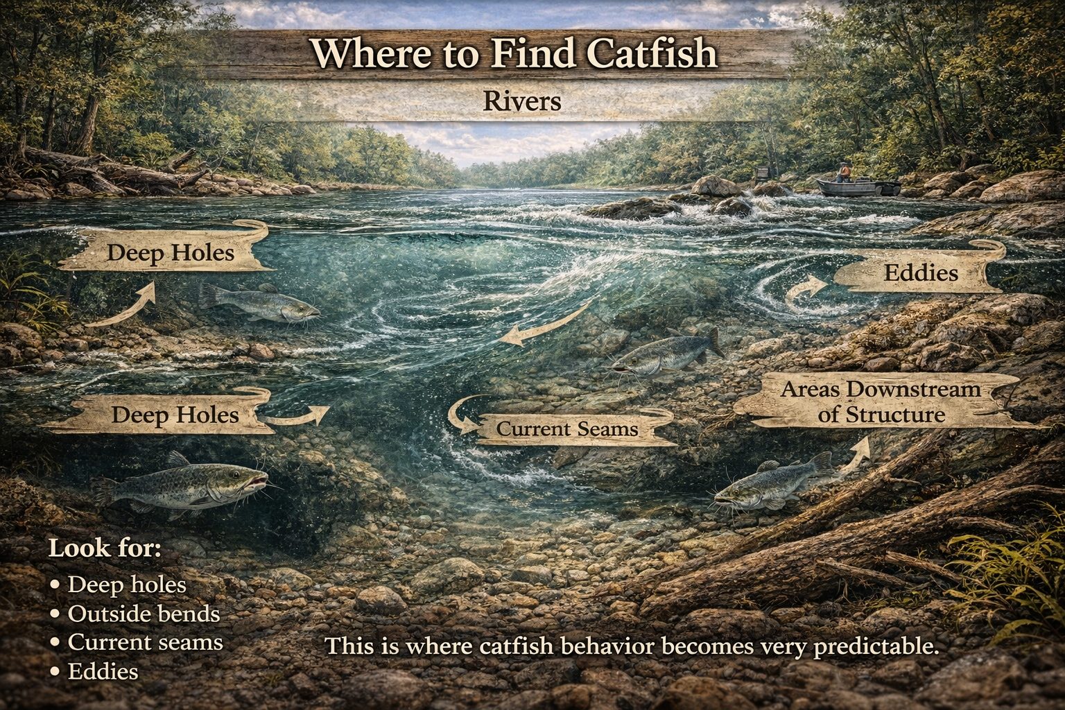 Catfish position where current brings food to them without forcing them to fight it.