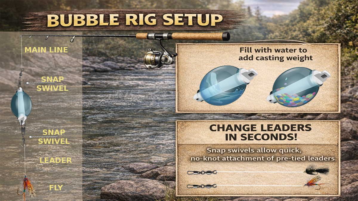 - Main line → snap swivel → bubble → snap swivel → leader → fly/bait